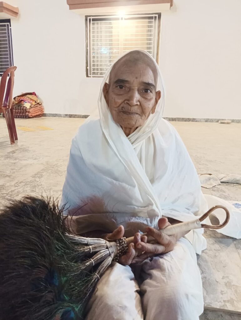 Aryika Shri 105 Vinamrajyoti Mataji was born on 25 December 1938 in Dharwar, Karnataka. Spiritual and religious values were present in her family from the beginning. Her grandfather was Muni Shri 108 Padmanandiji Maharaj and her paternal aunt was the late Samadhisth Aryika Shri 105 Sonadevi Mataji. Inspired by the spirit of renunciation, she received Aryika Diksha on 10 February 2016 at Dharmsthal in Dakshina Kannada district of Karnataka under the guidance of Ganini Aryika Shri 105 Jinvani Mataji. After receiving Aryika Diksha, she came to be known as Aryika Shri 105 Vinamrajyoti Mataji and since then has been continuously engaged in spiritual practice and the propagation of Jain dharma.